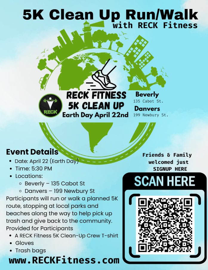 Sign up to join our Earth Day 5K Clean-Up Run/Walk on April 22 at 5:30 PM! We’ll meet at our Beverly (135 Cabot St) and Danvers (199 Newbury St) RECK locations before heading out on a planned 5K route (run or walk) to help clean up local parks and beaches along the way.